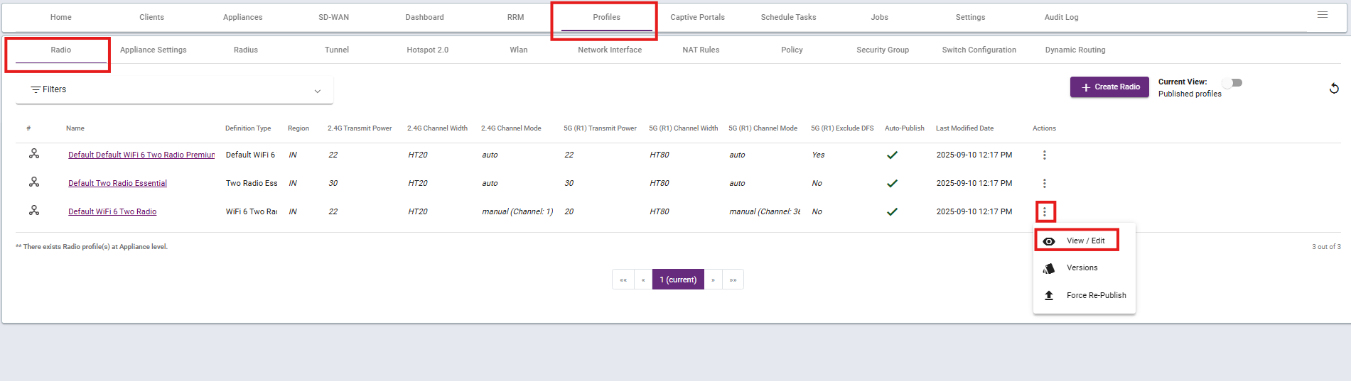 From the drop-down, select View/Edit. A pop-up window will open with the Radio Profile settings.