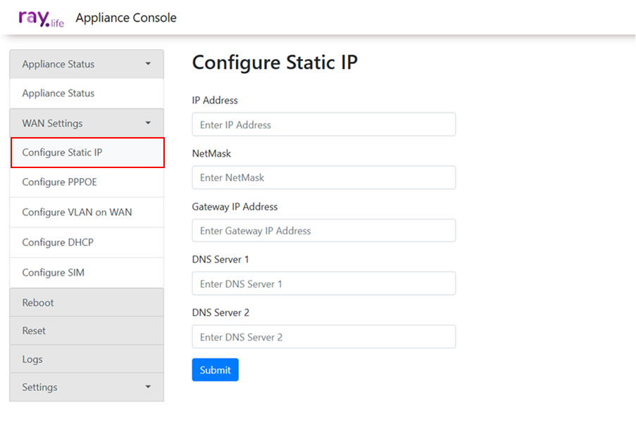 To configure the WAN using a static IP address, navigate to the WAN Settings tab. Select the option Configure Static IP, and then input the required network details as specified for your setup. Ensure all configurations align with your network requirements before saving the changes.