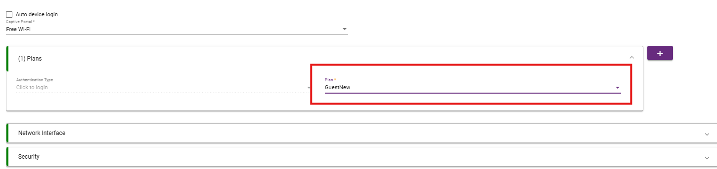 In the Plans tab, select the security groups you want to apply to this captive portal. To add multiple groups, click the “+” icon on the right side of the tab.