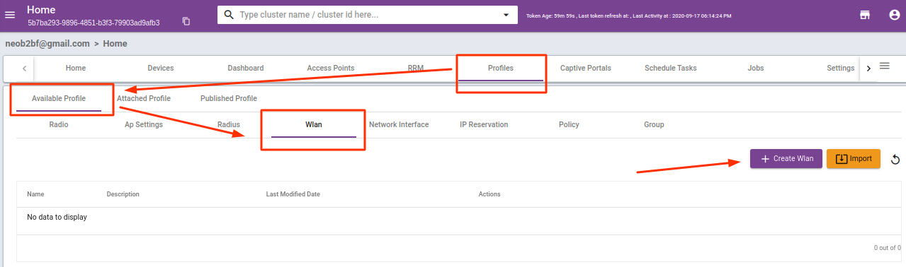 1) Go to the Profile tab of your cluster and then Available Profile > Wlan, click “Create WAN“.